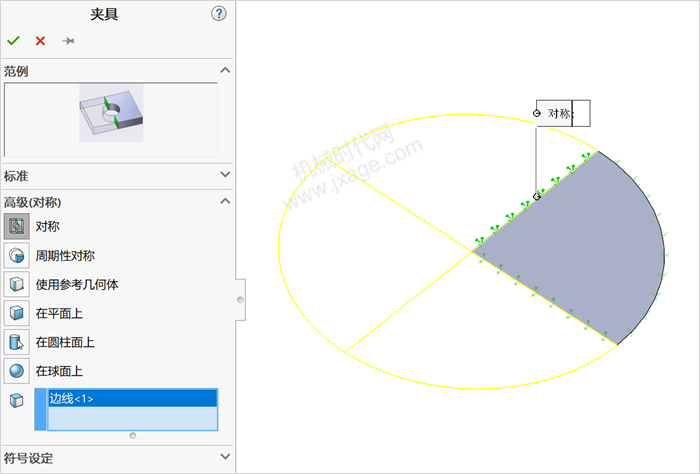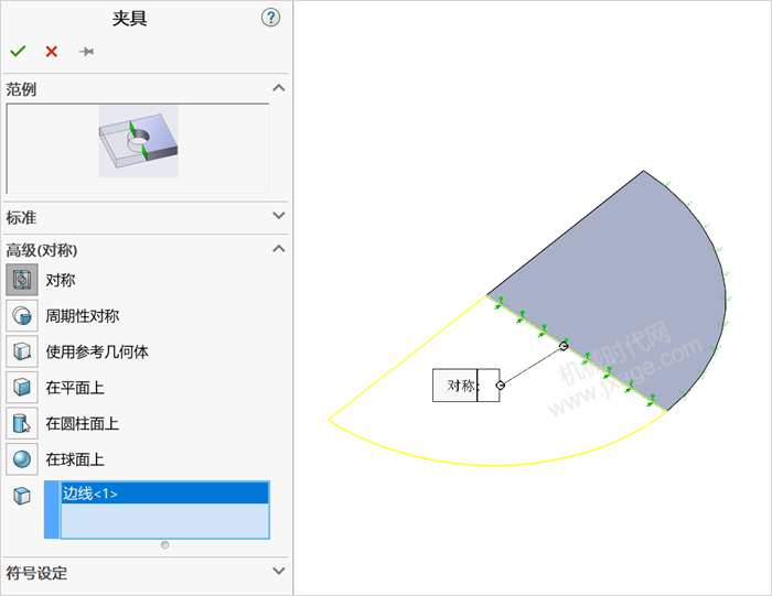 7.在Simulation分析树中右键单击夹具并选择高级夹具,选择对称,然后选择如下图所示的边线。