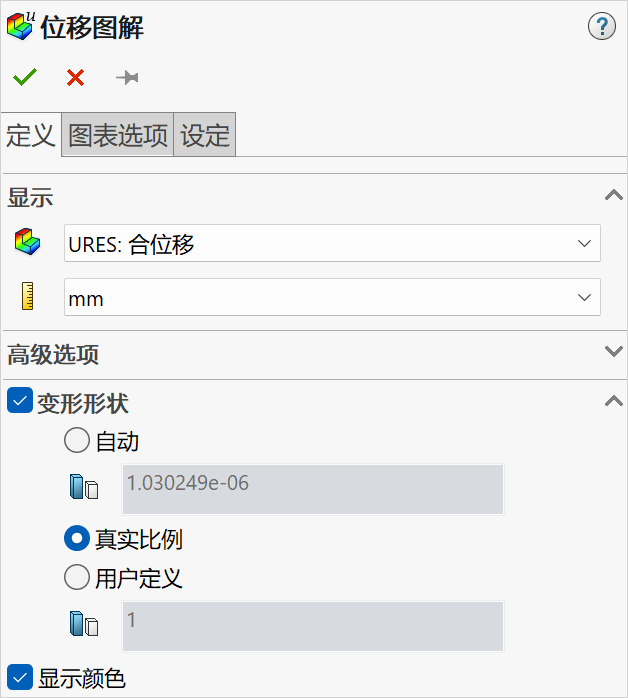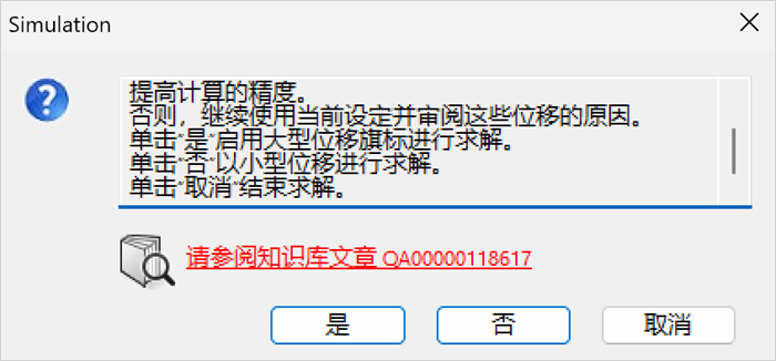 单击【否】是为了查看线性分析的结果。线性静应力分析的结果有助于判断是否需要采用大型位移分析。