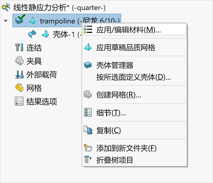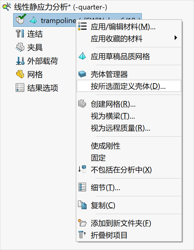 3.定义壳曲面和厚度,使用壳单元对蹦床进行网格划分。在Simulation分析树中鼠标右键单击实体并选择“按所选面定义壳体”,如下图所示。