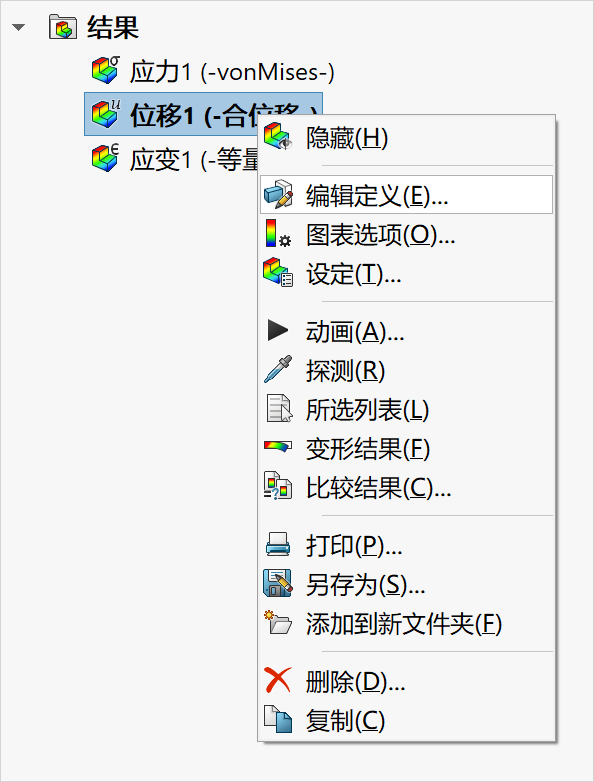 11.当前模型只展示了1/4的模型,我们可以展示完整的模型。鼠标右键点击位移1(-合位移-),选择编辑定义,如下图所示。