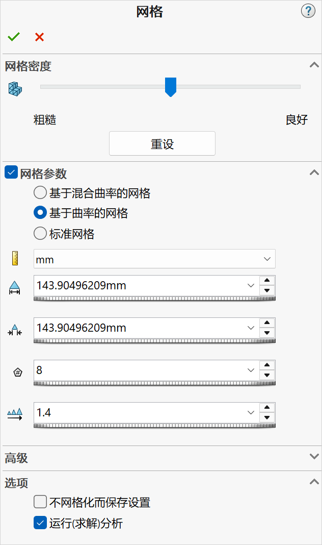 9.生成网格并运行算例。使用默认参数生成网格,勾选【基于曲率的网格】和选项组中的【运行(求解)分析】复选框。