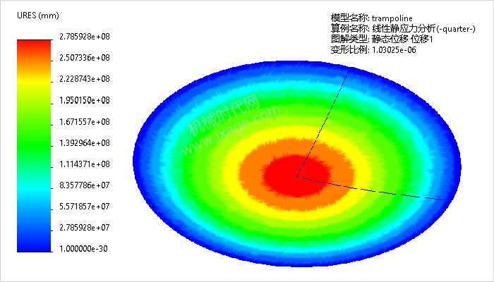 如下图所示的圆形尼龙蹦床的直径为4740mm,厚度为0.25mm。蹦床的生产商需要考虑雨天收集水后其最大挠度。在蹦床顶面加载了747Pa的均匀压力,以模拟76mm深的水。