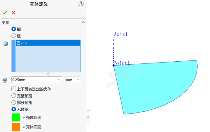 选择蹦床顶面,【类型】选择【细】,在【抽壳厚度】中输入0.25mm,如下图所示。