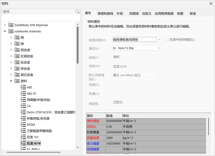 选择塑料文件夹下的尼龙 6/10,尼龙材料采用线性弹性各向同性,然后点击应用。