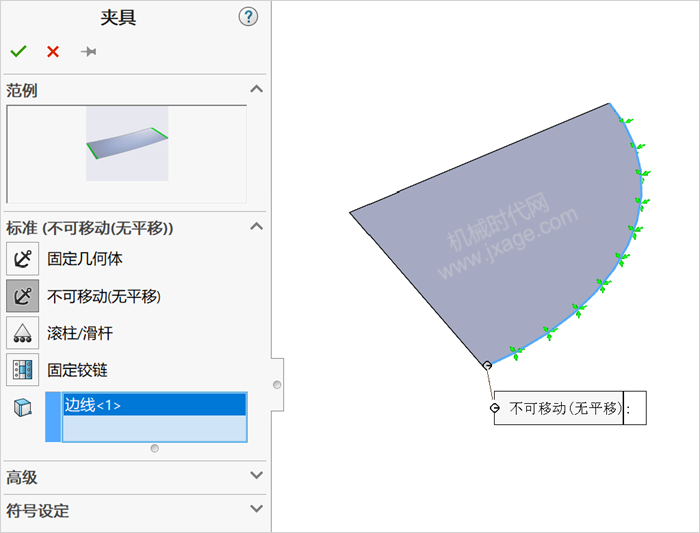 对壳体圆弧边线指定【不可移动(无平移)】的夹具,如下图所示。
