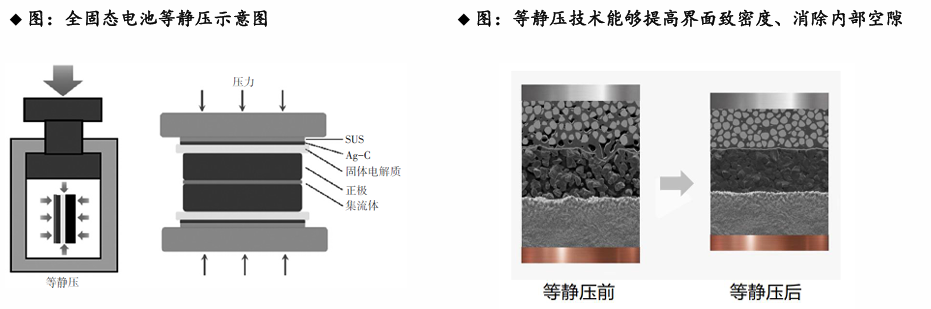 等静压技术用于改善全固态电池固固界面接触问题,拉动等静压机成为核心增量设备之一。等静压技术基于帕斯卡原理,能够提高界面致密度、消除内部空隙,改善组件接触效果,从而有效降低内阻、减少孔隙率、延长循环寿命并提升库仑效率。经过等静压处理,离子电导率可提升 30% 以上,内部电阻率降低 20% 以上,循环寿命提升约 40%。这一显著优势正推动等静压机成为固态电池生产的核心增量设备。