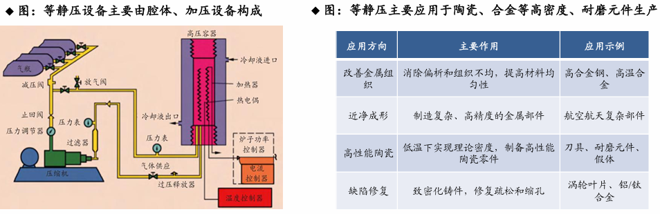 等静压设备应用领域广泛,冷/温/热等均有特定适用行业。等静压技术最初主要应用于金属与陶瓷领域,凭借其致密化与组织均匀化优势,逐渐广泛用于改善金属组织、近净成形、高性能陶瓷致密化、缺陷修复等领域;历经七十年验证,该技术早已成熟应用于航空航天、医疗、汽车、电子等多种工业场景。按成型与固结温度不同,等静压技术分为冷、温、热等三类:“冷—温—热等静压依次对应工作温度递增、所需压力递减,成品致密化程度与生产成本递增,而生产效率递减。其中温等静压在致密化性能、生产效率与成本之间实现平衡。