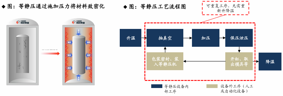等静压工艺利用流体介质的不可压缩性与压力均匀传递特性,向被压材料均匀输送压力使其致密化。等静压将粉体材料、零部件或电芯装入高压容器,通过压力泵/压缩机注入气体、水或油等介质并加热,使腔体内各方向承受一致压力,从而使粉末或待压实的烧结坯料(或零件)致密化、形成高密度成型体。等静压工艺主要流程为包套密封、升温、抽真空、加压、保压、降压、降温等。工艺上,材料先包套密封,装入升温完成的设备后经抽真空,随后注入流体介质并加压,确保压力均匀传递并压实内部粉体。完成保压后依次卸压、取出,最终获得高致密度成型体,适用于电池与陶瓷等精密制造场景。设备在使用前和使用后需要经过升温和降温的流程,但在连续生产过程中无需每轮重新升降温。