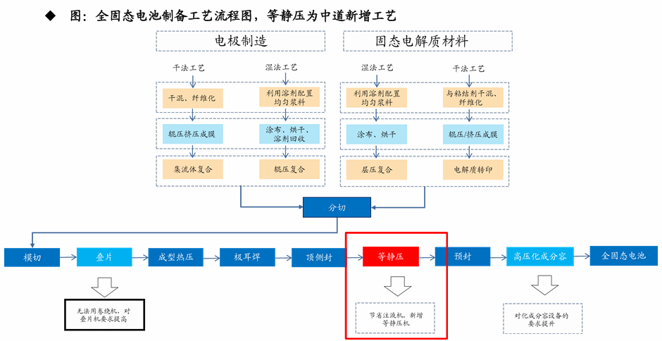 固态电池中道新增等静压工艺,主要用于叠片后的致密化环节。等静压工艺应用于电芯成型后,通过均匀多向压力实现致密化,消除固固界面空隙,提升电解质与电极接触质量,改善离子传导率和循环性能。这一工艺有效解决界面贴合难题,是实现电池高能量密度和高稳定性的核心环节。