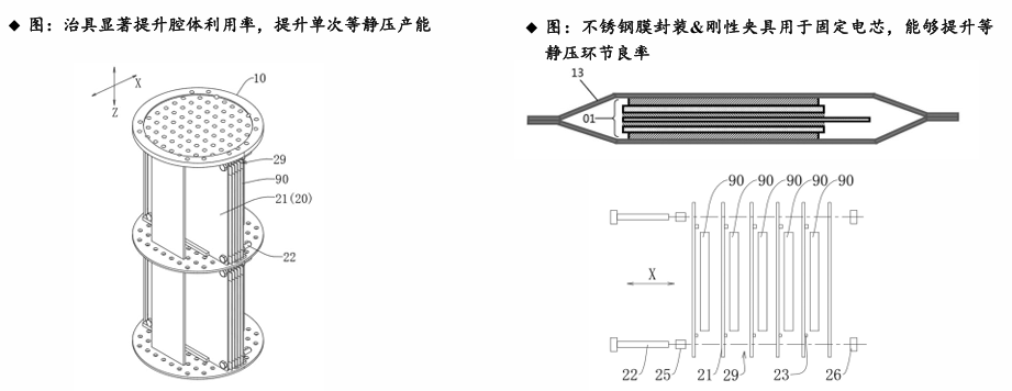 解决方案一:前处理工艺优化降低温度与压力要求。在等静压前,通过材料配方或预处理工序使加工件更柔软、更致密,可在较低温度和压力下完成致密化。根据我们草根调研,国内头部固态电池玩家计划将目标温度由 200 ℃降至120℃,可将升温时由45–70 分钟间缩短至约 20 分钟,同时减少降温与保压时间,从而显著压缩单轮加工节拍。