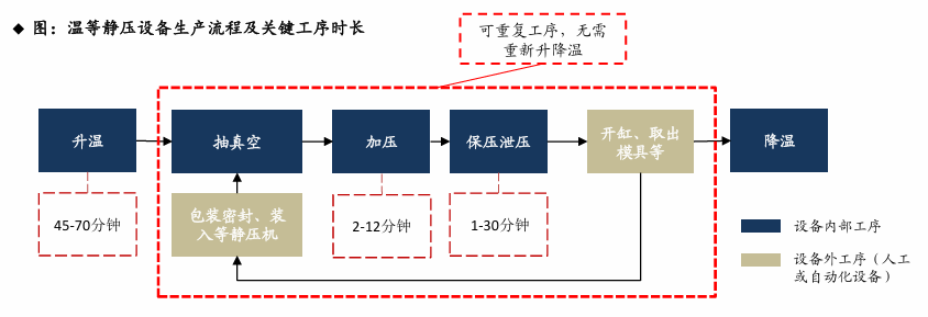温等静压在固态电池制造中节拍较长,关键耗时集中在加压和保压泄压环节。 在固态电池生产过程中,温等静压工序包括包套密封、装入已完成升温的等静压机、抽真空、加压、保压泄压、以及取出模具等环节,其中加压(2–12 分钟)和保压泄压(1–30 分钟)占据了每轮流程主要时间,整体工序周期较长,是产线节拍的关键限制因素。升温(54-70分钟)和降温时间较长,但在连续生产过程中无需每轮重新升降温,对生产节拍的影响次于加压-泄压环节。
