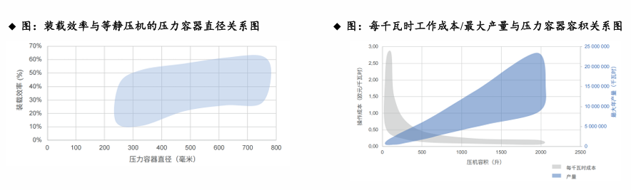 从产能端看,腔体容积增大可显著提升装载效率(即腔体内空间利用效率)。Quintus的实验结果表明,随着压力容器直径增大,装载效率由不足 20% 提升至超过 60%,有效减少腔体内部的“死区”并降低装夹频次,从而提升单轮装载的加工件总量。在年化产量上,结果显示单台压机的处理能力可随容积成线性增长,最大年产能可突破 20 GWh,当前Quintus的QIB设备能够做到年产能22.6GWh。