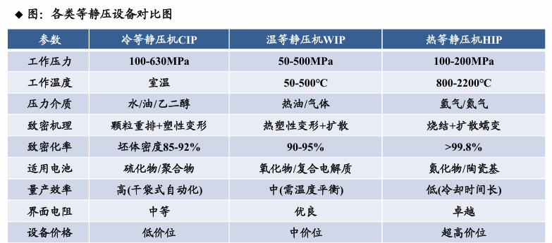 温等静压压力与温度区间契合固态电池致密化要求,是当前最优工艺路径。温等静压在中温条件下压制,可提升界面接触和致密度,又避免高温副反应。其温度区间与固态电解质稳定性契合,能在保持性能的同时改善界面质量。同时设备能耗和成本相对较低,具备产业化潜力,正成为电池厂商与设备商重点推进的工艺。