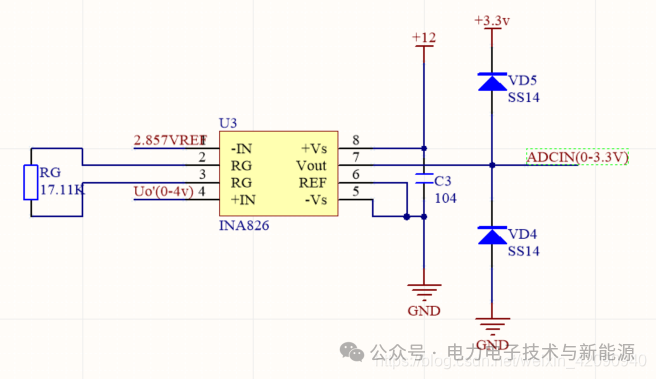 2、差分并放大2.887倍及钳位电路(计算方法:3.3/(4-2.857),差放直接输入给AD不需要阻抗匹配)