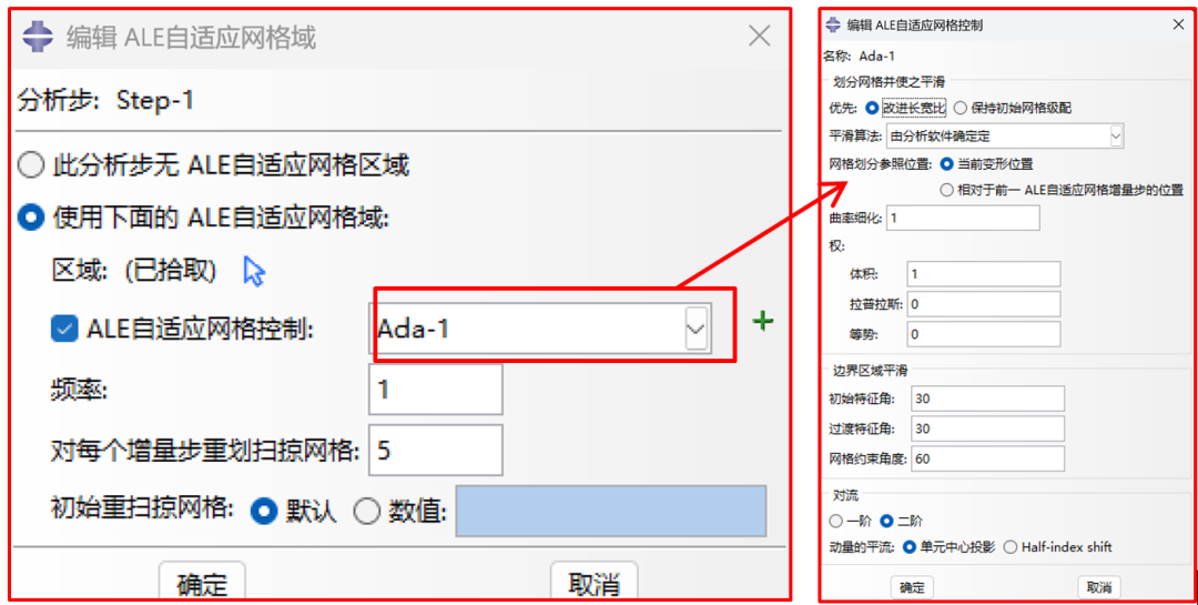 弹出设置ALE设置界面,区域选择整个橡胶坯件。“频率”是指多少个增量步重新划分网格,这个值应该取小一些,“对每个增量步重划扫掠网格”是指每增量重新划分网格的次数,这个值可以取大一些。自适应网格控制可以采用默认设置,见图6。