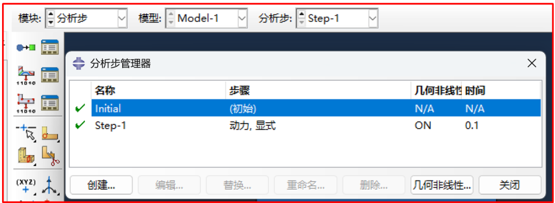 分析类型选择“动力,显式”,时长为0.1s,打开几何非线性,增量步采用默认设置。