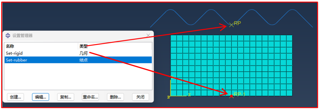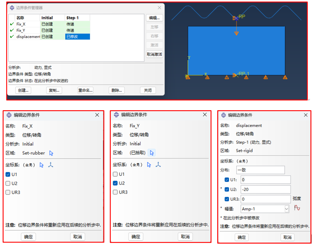 橡胶底面设置Y方向约束,底面的中点设置X方向约束,这样设置是为了橡胶件在X方向能自由压缩。刚体的中点(即RP处)施加Y方向-20mm的位移,详细设置见图10。