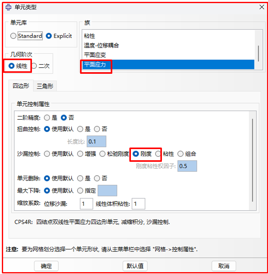 对橡胶坯件进行网格划分,在设置单元类型时,需要特别注意:使用ALE自适应网格划分,几何阶次只能选择低阶线性,需要选择基于刚度的沙漏控制。见图11。