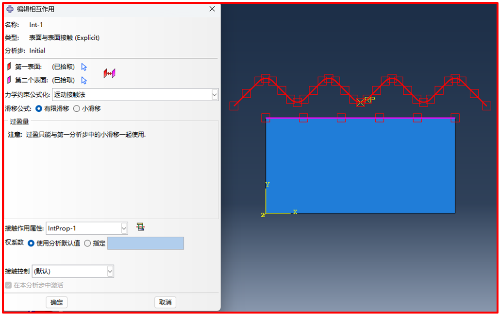 在此处只需要设置模具挤压橡胶坯件时的接触,采用“面-面”接触,第一、二表面分别选择模具下表面、橡胶坯件上表面,见图7。