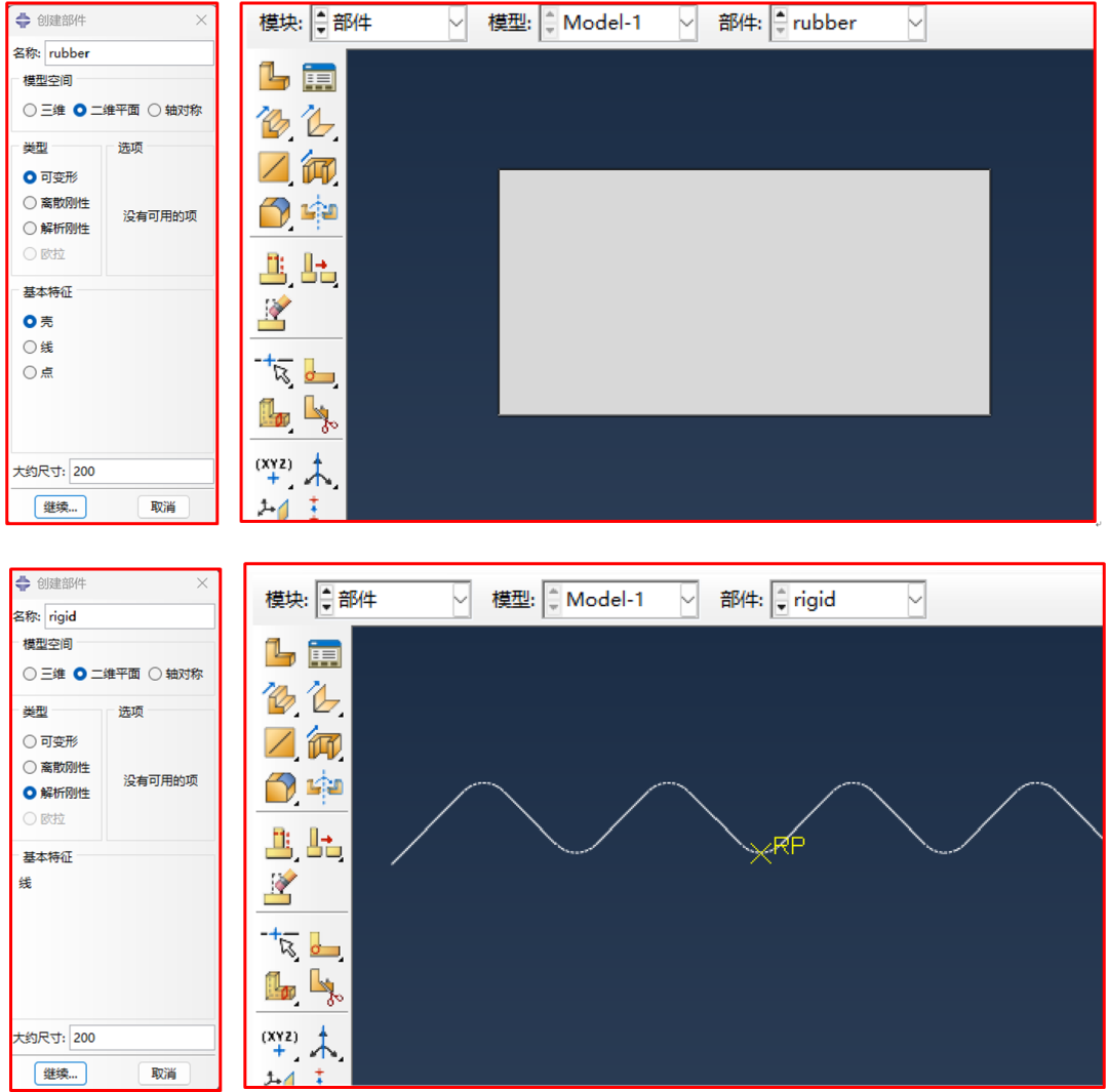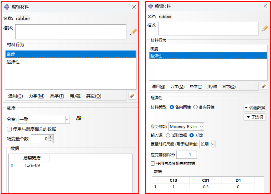 设置橡胶材料属性,赋给坯件,模具使用解析刚体来表示,因此不需要赋予材料。
