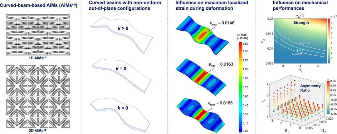 基于架构不稳定性的人造材料(AIMs)由多稳态的基本构建单元组成,能够经历高度可逆的几何相变,使其成为诸如耗能结构和微机电系统(MEMS)等动态系统的理想选择。尽管先前的研究主要集中在平面几何和整体响应上,但关于平面外几何如何影响 AIMs 的关键机械行为的研究却很少。在此,我们研究了一类由弯曲梁构建单元构成的代表性 AIMs,即 AIMs^cb,并探讨了其平面外几何如何影响关键性能指标。AIMs^cb 依靠细长梁的弹性屈曲来实现可逆性,这限制了其强度和能量耗散。其有限的几何可调性也限制了其在需要多种多稳态行为的 MEMS 中的应用。为了解决这些局限性,我们引入了一个新的几何控制参数 k,以调整 AIMs^cb 的平面外几何形状并调节其机械性能。我们的研究结果表明,k 控制着最大应变的局部化,从而控制着多稳态响应的可逆性和鲁棒性。通过有限元模拟、数字图像相关技术和循环压缩实验,我们证明了 k>0 的 AIMs^cb 实现了高达 62.1% 的抗压强度提升和 45.6% 的能量耗散增加,同时还能够实现更广泛的可调多稳态行为。平面外几何形状的简单制造进一步增强了 AIMs^cb 的实际应用性,使其应用范围从包装、减震和冲击防护等以能量为重点的应用扩展到包括 MEMS 和其他多稳态驱动设备在内的自适应系统。