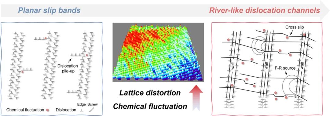位错控制着结构合金的塑性变形能力。然而,这种有益的作用在难熔多主元素合金(rmpea)中受到损害,其中由于平面滑移和位错通道引起的塑性应变局部化而导致拉伸延展性下降。我们提出了一种基于工程位错通道的延展性概念,以转移和疏通位错,在铸态RMPEA中获得了21%的显著拉伸延展性和超过千兆帕的屈服强度。为了验证增强的晶格畸变和化学波动作为位错转移剂的假设,我们设计了具有不同体积失配和Warren-Cowley参数的Ti53V15Hf32 (V15)和Ti41V27Hf32 (V27) RMPEAs。原位同步加速器高能x射线衍射和透射电镜分析表明,在拉伸载荷下,体积错配的增加促进了位错特征从边缘型(V15)向螺旋型(V27)的转变。原子探针层析成像和高角度环形暗场扫描透射电镜表征进一步表明,V含量的升高引起了明显的化学波动,导致位错滑移的转移和河流状位错通道的形成。这些位错通道一方面通过通道边界的密集相交促进了动态应变硬化。另一方面,它们通过使位错在通道内增殖和交叉滑移来防止过早的颈缩和失效。因此,河状位错通道延迟了超高屈服强度下的塑性不稳定性,从而使RMPEA释放出优异的拉伸延展性。这些发现为rmpea中追求强度-延性协同提供了脱位控制途径。