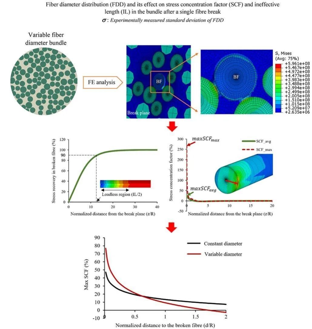 Finite element modeling is conducted to simulate the stress redistribution around a broken fiber (BF) in a bundle with experimentally measured fiber diameter distributions (FDD), followed by a parametric study of the influence of the FDD coefficient of variation on the stress concentration factor (SCF) and ineffective length (IL). Two variants of the SCF definition are considered: based on average, SCFavg, and maximum, SCFmax, stress in the fiber cross-section. Results demonstrate that bigger fiber diameters show higher SCF and clustering of such fibers increases SCF in nearest neighbor fibers (NNFs). Critically, maximum stress-based SCF (maxSCF_max) significantly exceeds average stress-based SCF ( maxSCF_avg), with differences about 40–75% in NNFs for FDD bundles compared to fiber constant diameter (FCD) bundles. This emphasises the necessity of prioritizing maximum stress criteria over conventional average stress models in failure predictions. The findings challenge benchmark models that rely on averaged SCF values, offering critical insights for improving accuracy in predicting fiber break propagation and composite strength.