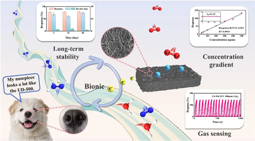 High-entropy carbon materials, a new class of functional materials, leverage multi-component synergy to precisely tune electronic structures and surface reactivity. Inspired by this concept, we developed biostructure-inspired high-entropy-like carbon materials derived from Undaria pinnatifida and applied them to room-temperature gas sensing. Freeze-drying followed by gradient carbonization produced a hierarchical turbinate-like porosity that mimics canine olfaction, while intrinsic multi-element (C/O/Na/Ca/P/S) coordination activated strong gas-surface interactions. DFT calculations confirmed that Ca doping increases hydrazine (N2H4) adsorption energy from -0.412 eV to -1.532 eV and charge transfer from 0.039e to 0.070e, and elevates O2 adsorption energy from -0.160 eV to -1.524 eV with charge transfer rising from 0.181e to 0.790e, validating the dopant’s role in boosting surface reactivity. Strategic defect and morphology engineering, coupled with multi-element self-doping, further enriched active sites, enabling the UD-500 to achieve a 14.12k% response to 500 ppm N2H4 at room temperature with a theoretical detection limit of 1.63 ppm, while exhibiting excellent repeatability, long-term stability (<3.5 % drift over 80 days), and humidity tolerance (11-94% RH). This work establishes a marine-biomass route to high-performance gas sensors and advances the valorization of waste biomass.