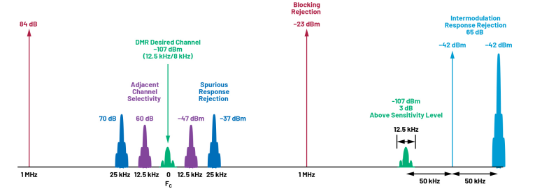 例如,若某接收机的噪声底为 -120 dBm,而它在偏离目标信号 20 kHz 处能承受的干扰信号为 -20 dBm,则其 BDR 为 100 dB。
