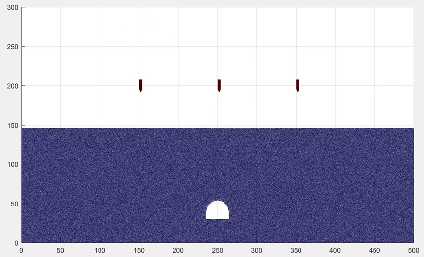 钻地弹破坏的目标通常包含地下工程结构,因此我们需要在地下挖出一个巷道,巷道需要设置支护衬砌来保障通常情况下岩石不会破碎向下进入到巷道之内。巷道一般是由一个矩形及一个半圆弧顶组成。在离散元中,将颗粒筛选出来之后删除颗粒,在区域内生成由多层颗粒组成的巷道。