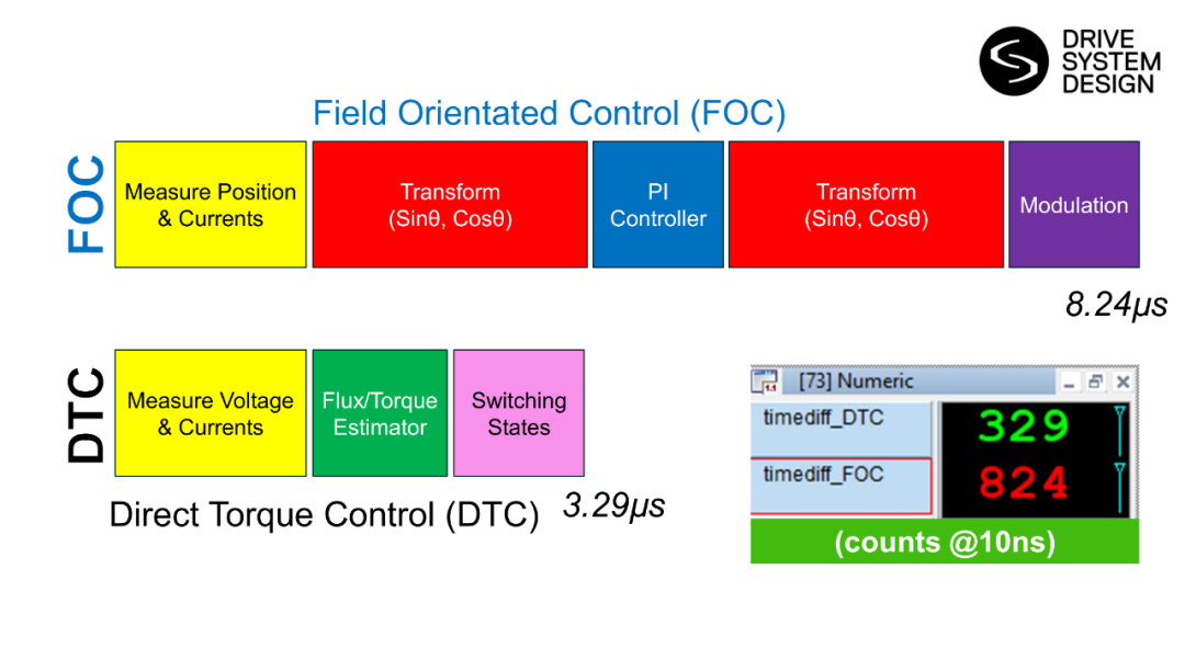 流程简化带来的最大好处就是速度飙升:DSD 实测显示,DTC 的执行时间仅需3.29 微秒,用 10 纳秒计数仅 329 次 —— 比 FOC 快了约 2.5 倍!