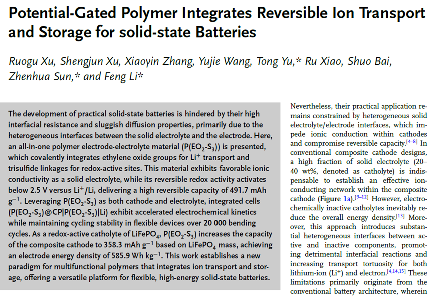 国庆期间好几篇固态电池进展的文章,有一篇是这个:P(EO2-S3)即能当电解质又可以当活性材料,可以让柔性电池达到20000次弯折,并且电极能量密度达到了585.9Wh/kg,那今天我们具体看一下这篇工作到底讲的啥,实用化前景如何。