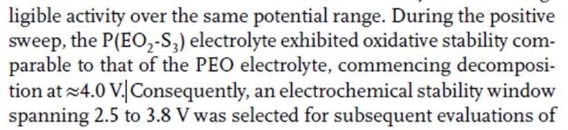 两种功能:电解质&活性材料。在低点的电位(对锂1.8V-2.5V)下是可以当正极活性材料的(497.1mAh/g);在更高点的电位下(对锂2.8V-3.8V)则是纯做导通离子的电解质(50度下注意,离子电导1.0*10−4 S/cm,锂离子迁移数0.53;如果是室温下的话大概是1.6*10-5S/cm,比PEO此时的3.0*10-6S/cm大概好五倍,以及PEO的锂离子迁移数只有0.31)。