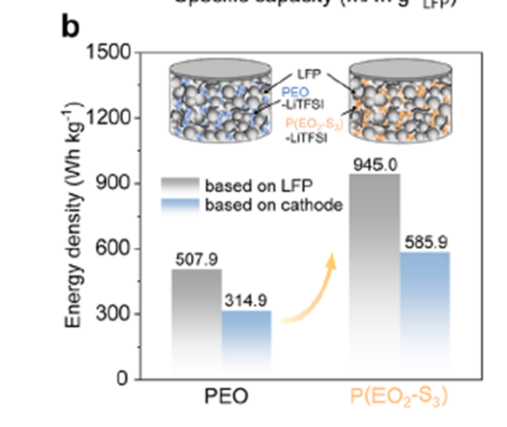 还要说一下这个能量密度计算:这篇文章中出现的能量密度有些数据都是正极电极而不是全电池的数据,这个在学术上表述上没什么问题,然而对于和公众的交流,还是建议编辑们提高一下知识水平,把这几个基本概念分开,否则很容易误导老百姓。比如下图(b) Comparison of energy density of the LFP-PEO and LFP-P(EO2-S3) composite cathodes),这是Composite cathode的能量密度,不是电芯。像磷酸铁锂的电极的能量密度怎么算?160mAh/g*3.4V=544mWh/g=544Wh/kg,再算上电极的一般的需要的一些非活性物质的稀释,当然也就是如图中的507Wh/kg了,这就是行业基本参数,而实际上你做了Catholyte复合,不可能不算上那些非活性质量,所以实际上电极就只有314Wh/kg了。而用了这个材料的Catholyte,当然效果是不错的,整体电极的比能量,如果按全质量来算,可以达到585.9Wh/kg,也是有明显进步的。但是,这不是你常见到的电池电芯的能量密度,差的远呢,不一码事。
