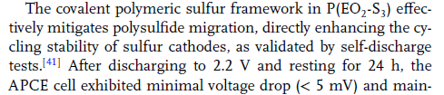 循环稳定性:另外一个这个P-EO2的高分子结构对于稳定化有电化学容量的S是有一些好处的:可以抑制多硫化物的溶出,从而实现更好的循环稳定性表现。