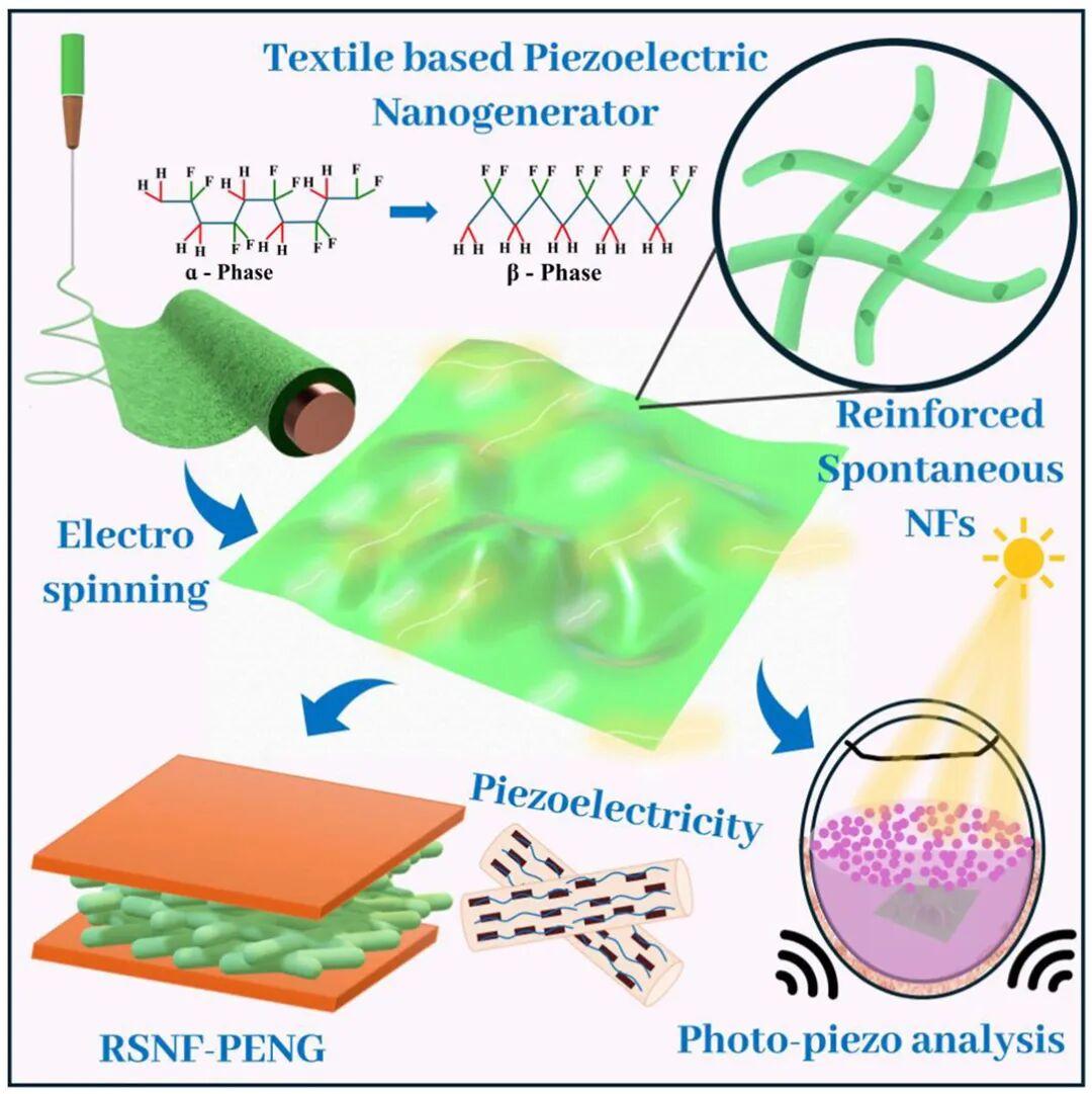 智能可穿戴设备通过有效地整合健康监测、能量收集和可持续技术,显著改变了当代的生活方式,从而促进了个人健康和环境可持续性的创新进步。本研究介绍了通过直接静电纺丝方法生产的增强自发极化纳米纤维(RSNF),该方法将尺寸限制和表面定制(SCST)碳化钒(VC) MXene纳米片纳入聚偏氟乙烯-共六氟丙烯(PVDF-HFP)纳米纤维复合材料中。MXene的加入促进了晶体相自组装成压电β相,从而大大提高了电荷转移效率。利用RSNF膜开发的压电纳米发电机有效地收集了生物机械能,实现了高达27.8 V的高输出电压和1.45 μA的电流。此外,在机械振动和太阳辐照作用下,RSNF膜在降解罗丹明B、茜素红和靛蓝胭脂红等带电染料方面表现出了显著的光压电催化能力。值得注意的是,通过协同压电-光催化,Rhodamine B的降解在120分钟内达到90%,超过了相同条件下单独光催化(41%)和压电催化(61%)的性能,从而突出了MXene与PVDF-HFP之间的协同作用增强了催化活性。开发的RSNF在回收后保持了88%的压电性能,展示了在智能纺织品和环境修复中先进可持续解决方案的可扩展潜力。