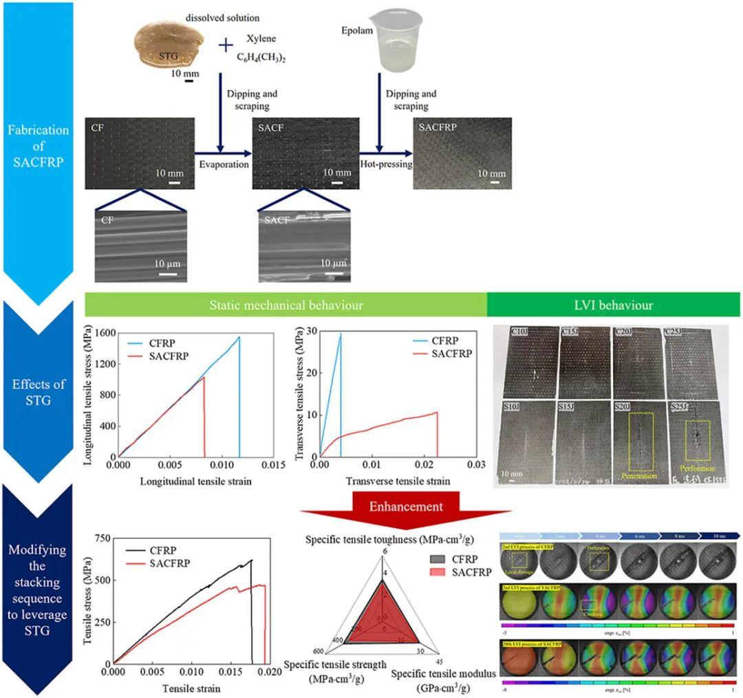 修改堆叠顺序,利用剪切增稠凝胶(STG)对STG应用于碳纤维增强聚合物(SACFRP)复合材料层合板的抗冲击性的影响