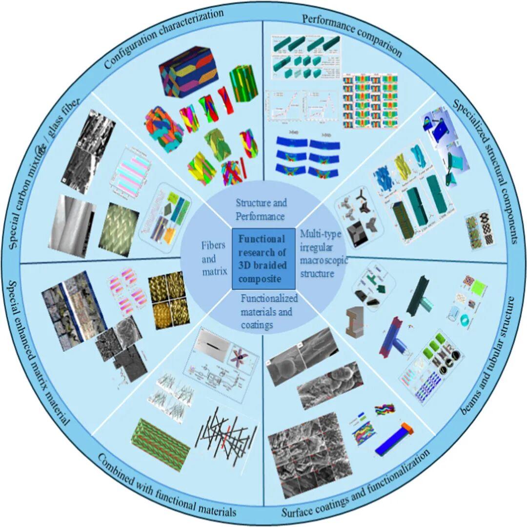 3D braided composites are advanced technological materials with unique structures developed based on two-dimensional braiding technology. These composites not only overcome the fatal defects of laminated composite materials, such as easy delamination failure, but also have great potential in multi-directional stress resistance, damage tolerance, and impact resistance. With the rapid development of aerospace and other fields, 3D braided composite materials are also constantly innovative and optimized to meet the functional characteristics of special parts in various fields. In this paper, the characteristics and applicability of micromechanical models for different 3D multi-directional braided structures are compared and a nalyzed, and the research progress on the comparison and an alysis of the mechanical properties of different braided structures under the same load types such as static/dynamic/multi-field coupling (which involves the interaction of mechanical, thermal, electrical, or other physical fields) has been summarized firstly. Secondly, the research of multi-environment adaptability of 3D braided structures through the special combination of different components (matrix/yarn) is an alyzed. Innovative designs for specific functions and needs, such as functional material embedding, coating modification technologies for matrices and fiber bundles, are further explored. Then, the mechanical behavior of 3D braided composites in typical special-shaped functional components (such as 3D braided T-beams and 3D braided tubular composites) is discussed. Finally, the problems in the current research are summarized, and future research trends are forecasted.