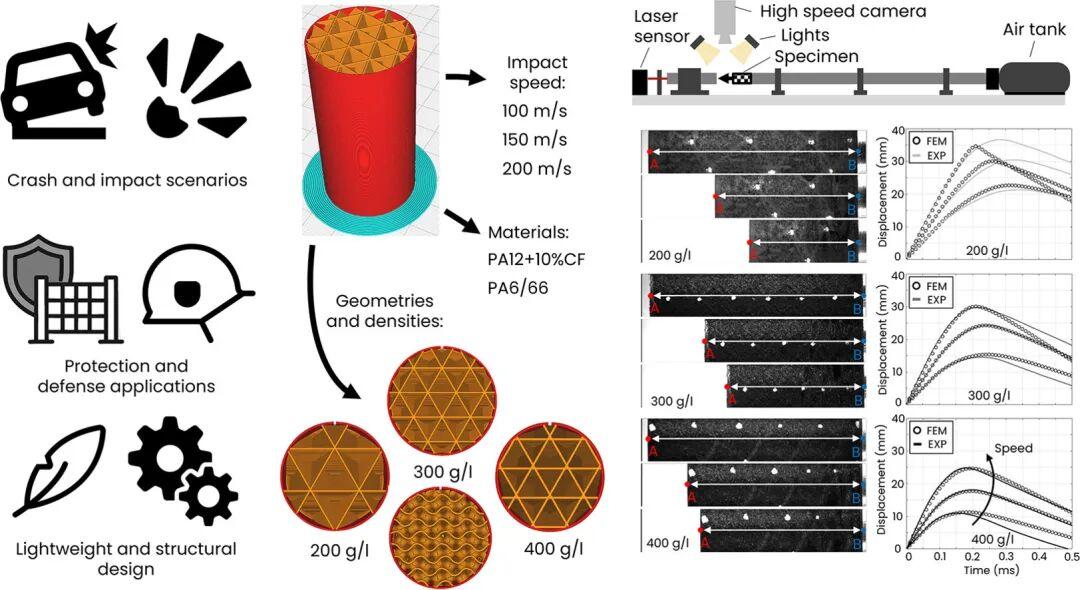 在过去的几年中,由于3d打印晶格和细胞结构具有出色的吸能能力和设计自由度,因此其耐撞性研究受到越来越多的关注。这些组件的高应变率行为尚未完全理解,因此它们的使用仍然受到限制。本文研究了3d打印聚合物细胞结构的高应变率行为,改变细胞拓扑结构,材料,密度和发射速度。在应变速率为0.01 s-1 ~ 3000 s-1的条件下,对试样进行了准静态和动态压缩试验。采用泰勒试验来实现高达200米/秒的发射速度,这在此类结构中很少进行研究。较宽的应变速率范围使结构的坍塌机制发生了显著变化,吸收比能显著提高。针对准静态和高应变率情况下的不同行为,提出了一种新的比能吸收评价方法。在短碳纤维增强和未增强的聚酰胺材料中得到了不同的结果,同时发现细胞拓扑结构对破坏行为有影响。非增强材料具有更高的应变率敏感性,但表现出更高的断裂和突变破坏,而增强材料表现出更稳定的行为。最后,建立了简化输入的简单有限元模型,以再现结构的变形和比能吸收。该模型旨在促进在大型耐撞性研究中使用更简单而准确的模型,在这些研究中可以使用3d打印聚合物结构。