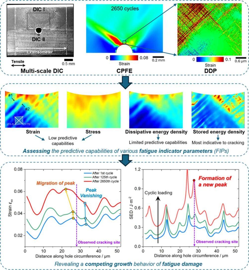 金属疲劳裂纹成核的机制驱动几十年来一直存在争议。为了解决这一问题,采用原位数字图像相关技术结合多尺度建模方法,评估了各种疲劳指示参数(FIPs)对单晶微裂纹形核的预测能力。传统的基于应力和应变的FIPs与观察到的疲劳开裂位置的相关性有限,而基于能量的指标,特别是耗散能量密度(DED)和存储能量密度(SED),与成核位置表现出显著的空间一致性。与DED相比,SED是一个更具指示性和明确性的指标,因为它包含了几何上必要的位错(GNDs)。我们通过实验揭示了低周疲劳中以前未被认识到的循环加载效应:滑移轨迹上的竞争应变增长在GND密度和相应的SED峰值中产生额外的波谷,而这种循环加载效应在高周疲劳中不存在。通过阐明gnd介导的损伤定位的关键作用,本研究推进了微结构敏感的疲劳损伤预测,并为金属系统中更可靠的疲劳寿命评估提供了一个基于物理的框架。
