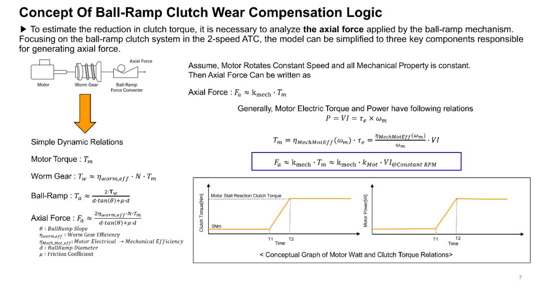 既然球形坡道离合器磨损后扭矩会下降,那如何通过控制逻辑 “补回” 这部分损失?现代威亚的解决方案,核心是 “建立电机功率与轴向力的关联,再通过补偿角度修正磨损偏差”。