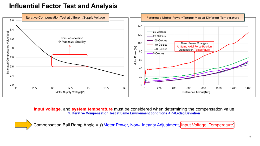 综合以上因素,现代威亚确定了球形坡道离合器的最终补偿角度公式:补偿球形坡道角度 = f(电机功率,非线性调整(斜率补偿),输入电压,温度)