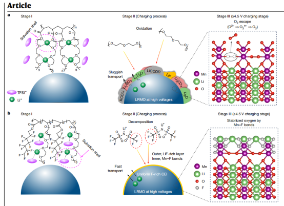 该工作用的是高分子聚合物(准固态电解质)体系fluoropolyether-based quasi-solid-state polymer electrolyte (FPE-SPE),具体材料是氟化聚醚高分子(fluoropolyether-based polymer electrolyte),这个材料可以创造出富阴离子(F-)的溶剂化结构,并且相应的在正极OLO表面生成保护层——因为OLO材料中的氧是不稳定的,很容易发生氧化反应逃逸出去,导致材料稳定性剧烈下降并且产气带来一系列问题。通过这个方法本工作构建了比较结实的CEI层,让OLO稳定化,这就是这个工作可以达成正极材料稳定/长循环效果的原因,如下图所示,a图是传统的OLO,b图是这个文章中体系稳定表面的OLO。