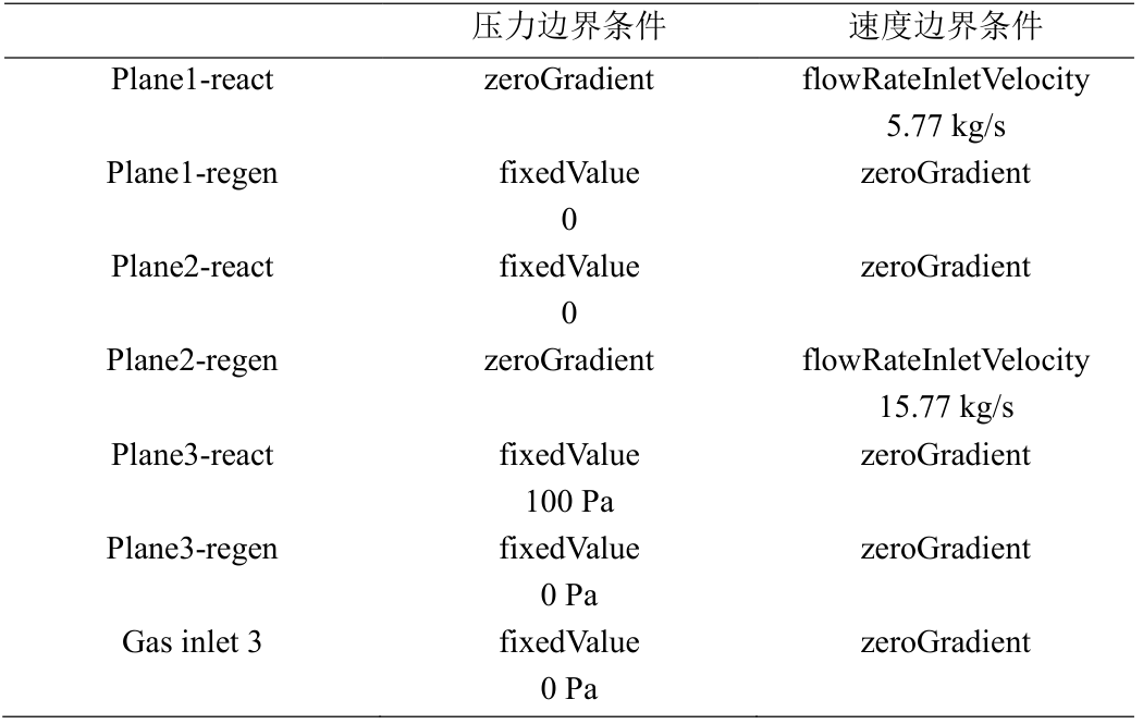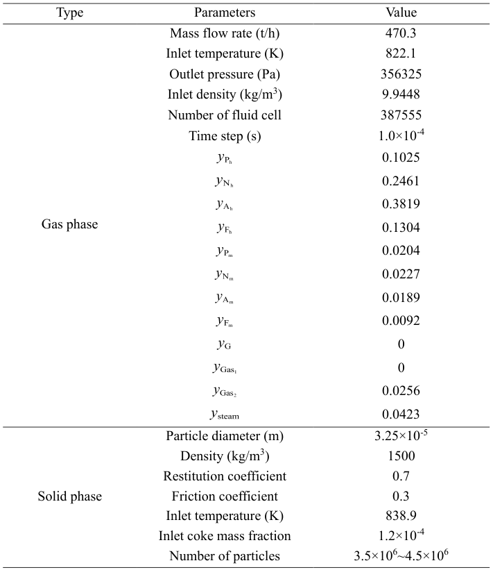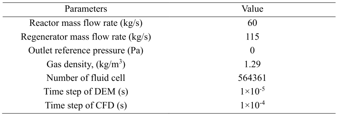 冷态模拟采用的操作条件总结为表2、表3,需要说明以下内容:冷态模拟采用的流体均为空气。如果反应器部分冷态模拟使用与实际系统相同的流体质量流率,则可能会出现如下问题:由于空气密度远远低于油气的密度,则冷态算例流体的气速是实际系统的若干倍。又由于曳力受气速的影响要大于受密度的影响,则可能会导致冷态算例颗粒受的曳力显著大于实际系统,导致流动模拟的不准确。因此本算例综合考虑流体和颗粒流动与实际系统的相似性,对反应器选取较低的流体质量流率以保证反应器内颗粒曳力与实际系统中一致。对再生器也采用类似的方法处理进气质量流率。