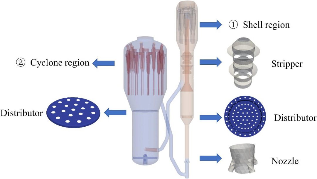 图1和图2分别展示了模拟颗粒和流体的设备构体。从图中可以看出,颗粒和流体的计算区域并不重合。图中①所表示的反应器外壳和②所表示的再生器旋风分离器,以及再生器底部气体分布器处均没有流体网格。