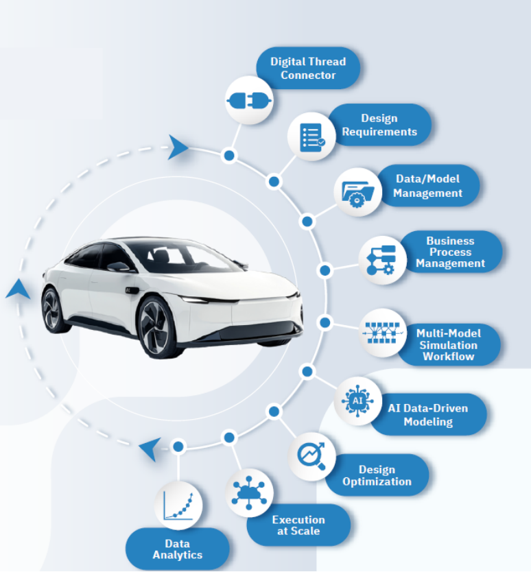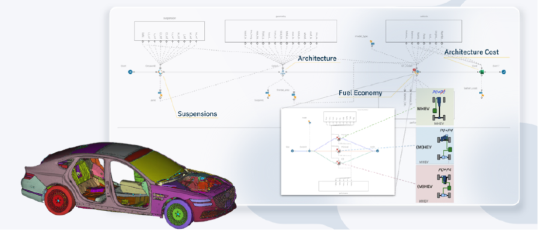 汽车行业应用方向 modeFRONTIER的强大功能已全面覆盖现代汽车研发的核心领域: · 整车架构与性能平衡:在概念设计阶段进行多属性(如性能、成本、续航)权衡分析,快速确定最优工程方案。 · 被动安全与碰撞优化:高效优化车身结构(如引擎盖、前纵梁),以满足五星安全评级和行人保护要求。 · 底盘性能综合优化:通过协同优化悬挂系统、衬套、阻尼器等部件,同时提升车辆的操控稳定性、驾驶舒适性与NVH表现。 · 电动化与三电系统开发:针对电池包、电机电磁性能、电控效率及热管理进行多目标协同优化。 · 空气动力学与流体分析:通过ROM等技术极大加速CFD和流固耦合分析,优化车辆气动外形,降低风阻。 · 动力总成与热管理:优化发动机性能、变速器效率以及冷却系统的热性能。 · ADAS/AD与自动驾驶系统验证:基于AI和场景生成技术,自动化地探索和识别自动驾驶功能在极端案例中的表现,加速验证流程并构建安全案例。 从传统燃油车到智能电动车,modeFRONTIER为汽车行业的每一次技术革新提供了关键的优化引擎。