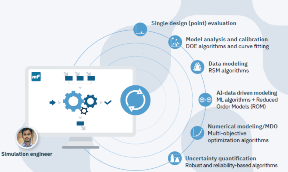 核心功能架构 完整的多学科优化(MDO)解决方案 modeFRONTIER提供完整的优化工作流,包含:模型分析与校准(DOE算法和曲线拟合)→ 数据建模(RSM算法)→ AI数据驱动建模(ML算法 + 降阶模型)→ 数值建模/MDO(多目标优化算法)→ 不确定性量化(稳健性和可靠性算法)。 供应商中立的集成平台 无缝集成CATIA、Creo、ANSYS、GT-SUITE、Adams、JMAG等主流CAD/CAE工具,形成自动化仿真工作流。 AI与机器学习深度集成 支持响应面模型(RSM)、机器学习算法和可解释人工智能(XAI),内置降阶模型(ROM)技术,大幅减少计算时间。