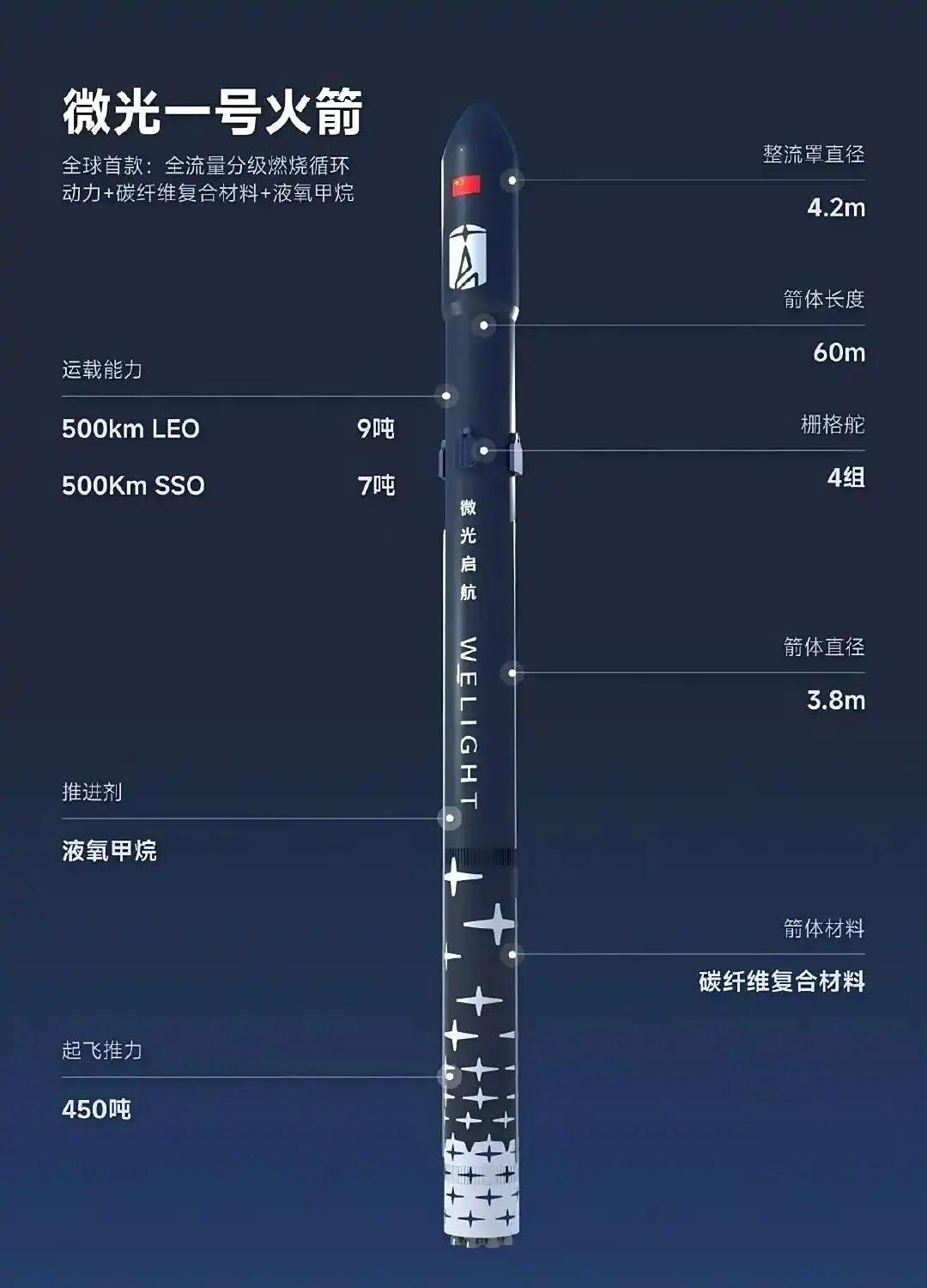 “微光一号”是国内首款全面应用碳纤维复合材料的运载火箭,配套自主研制的全流量液氧甲烷发动机。其碳纤维复合材料相较传统金属材料减重30%以上,兼具高强度与耐极端环境特性。