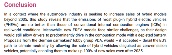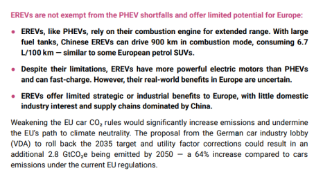 有兴趣的朋友可以看看报告一开始的这一段话:中国的增程如果用内燃机模式开,要6.7L/100km,与欧洲的烧油的SUV相当,他们也承认EREV增程的确电机更猛也能快充,但是放在欧洲的实际表现可能不好说。以及:EREV给欧洲提供的战略和工业上的好处太有限,供应链被中国占了。以及后面还说VDA想把CO2排放目标回调,看这态度T&E明显是反对的。