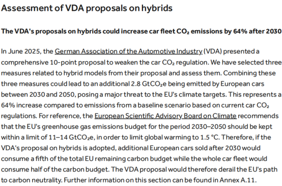 l报告严厉批评了德国汽车工业协会提出的削弱CO₂排放标准的建议。